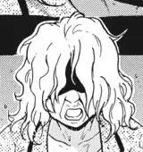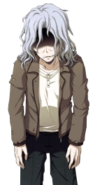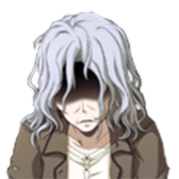Makina appears as an old lady. She has long, messy white hair. Her eyes are not visible. She wears a brown jacket over a beige shirt and black pants that are slightly torn.