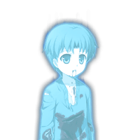 As a ghost, Ryou's appearance differs in different stories. In the games, he is a blue spirit with visible stab wounds on his stomach and blood coming out of his mouth. His sweater's collar is also torn and stretched out. In the Corpse Party: Blood Covered manga and in Corpse Party: Another Child, his eyes are also seen as hollow or completely black. His outfit is also noticeably different in Corpse Party: Blood Covered manga, where his sweater is now a simply shirt and his shorts are replaced by pants.