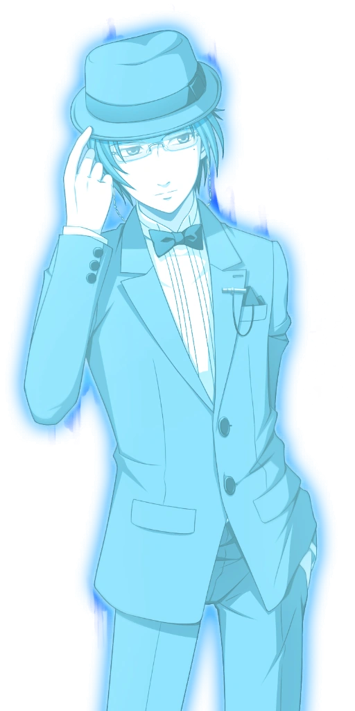 Shimoda is a handsome young man with slicked-back dark hair of mid-length. He wears a gray single-breasted tuxedo with a black bowtie and white undershirt, gray pants, brown shoes, and has a pair of narrow glasses and a felt hat, both of which he treasures deeply. As a ghost, he has a glowing body that is colored with a bluish hue. He also has the ability to take the form of a blue flame, reflecting his overall benevolent nature.