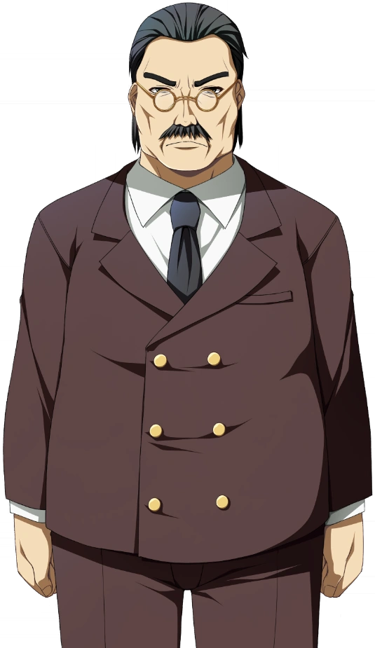 Takamine is a middle-aged man of below average height and above average weight. He has slicked-back black hair and a black mustache. He wears round-lens glasses with a golden frame, a white shirt, a black tie, and a bole-colored suit. In Corpse Party (PC), his suit is purple, and his tie is gold with white dots and has grey hair and a grey mustache. As a spirit, his skin is gray, his clothes are ripped, and the frames of his glasses seem to have been broken.