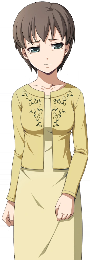 Yukie is an adult woman. She has short brown hair and green eyes. She wears a yellow dress and a darker yellow long-sleeved jacket, embroidered with leaves.